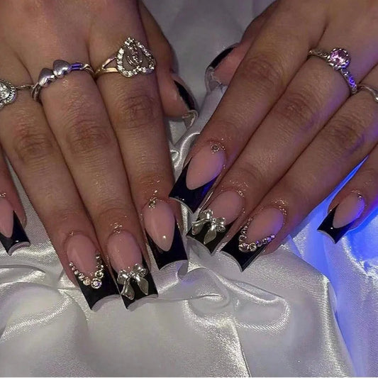 Chic Black French Press-On Nails with Pink Flower Charms – Stylish & Detachable Square Tips for Women & Girls