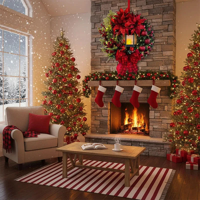 30CM Christmas Front Door Wreath – Red Ornament & Pine Garland Holiday Hanging Decor