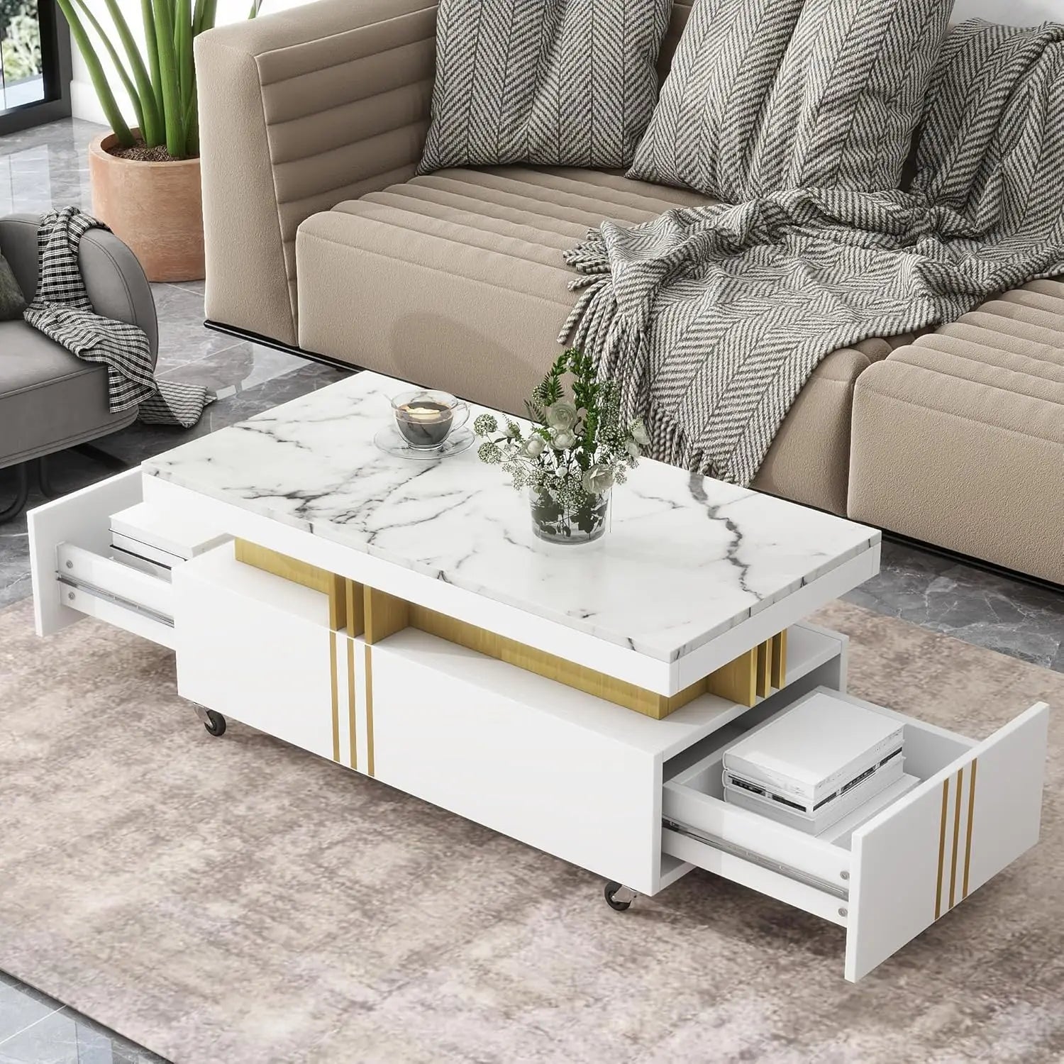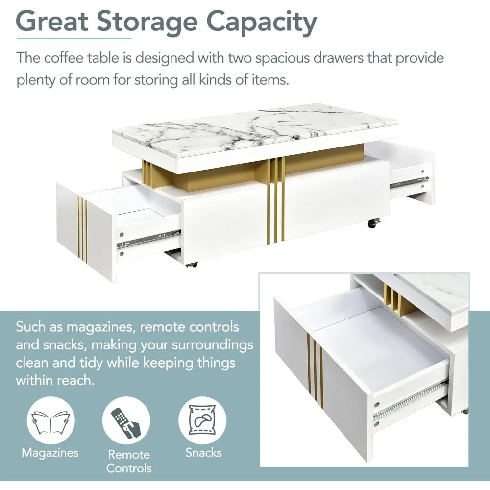Coffee Table with Faux Marble Top, Modern Center Table with 2 Drawers & Caster Wheels, Contemporary Luxury Cocktail Table