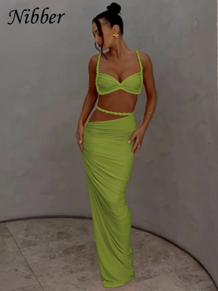 Nibber Sexy Women 2 Piece Set Bandage Ruched Square Collar Bra+Skinny Long Skirts 2025 Summer Vacation Beach Party Trend Suits