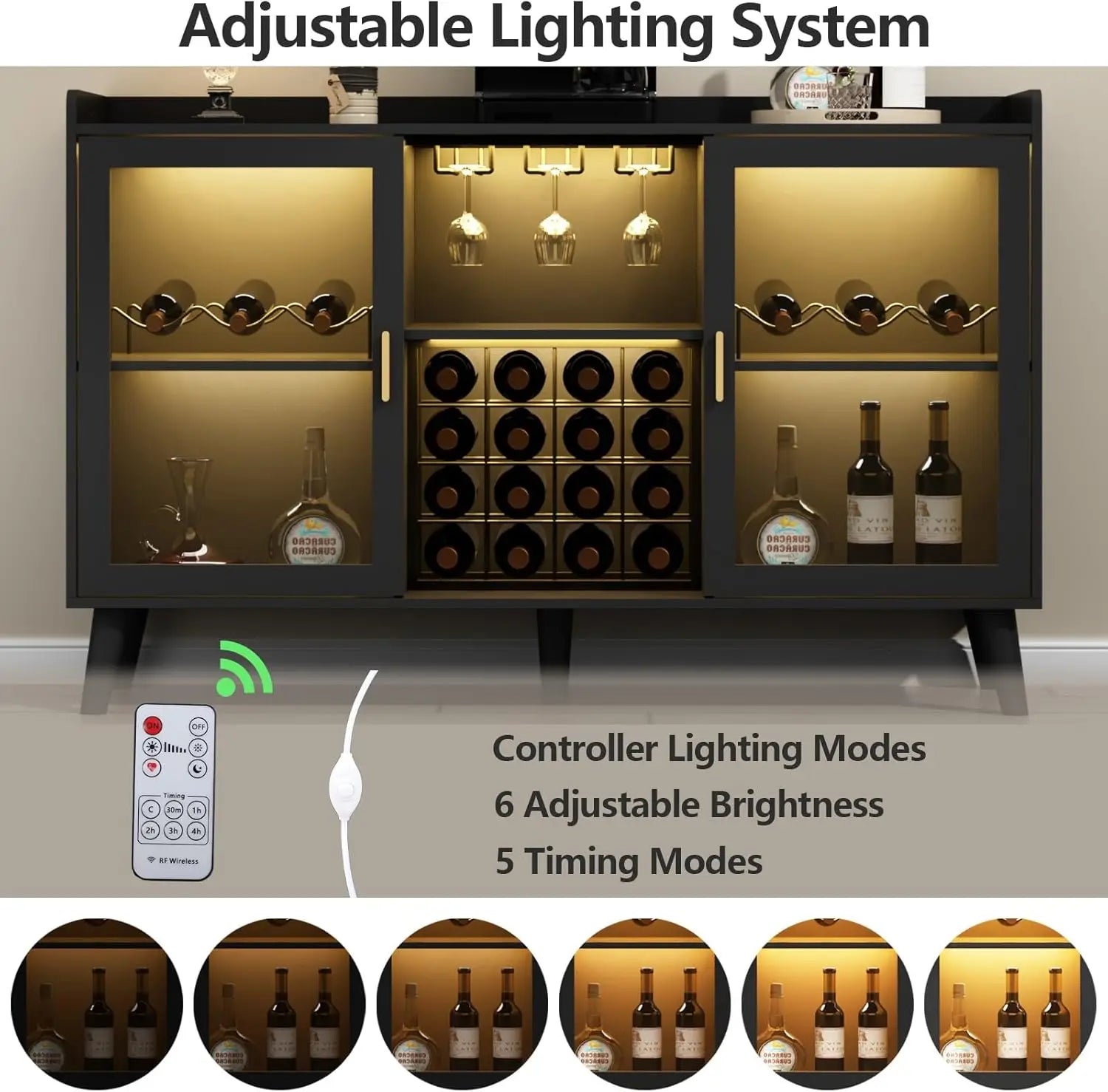 Wine Bar Cabinet with LED Light, Home Coffee Cabinet with Wine Rack and Glass Holder, Kitchen Buffet Sideboard W Storage Shelf